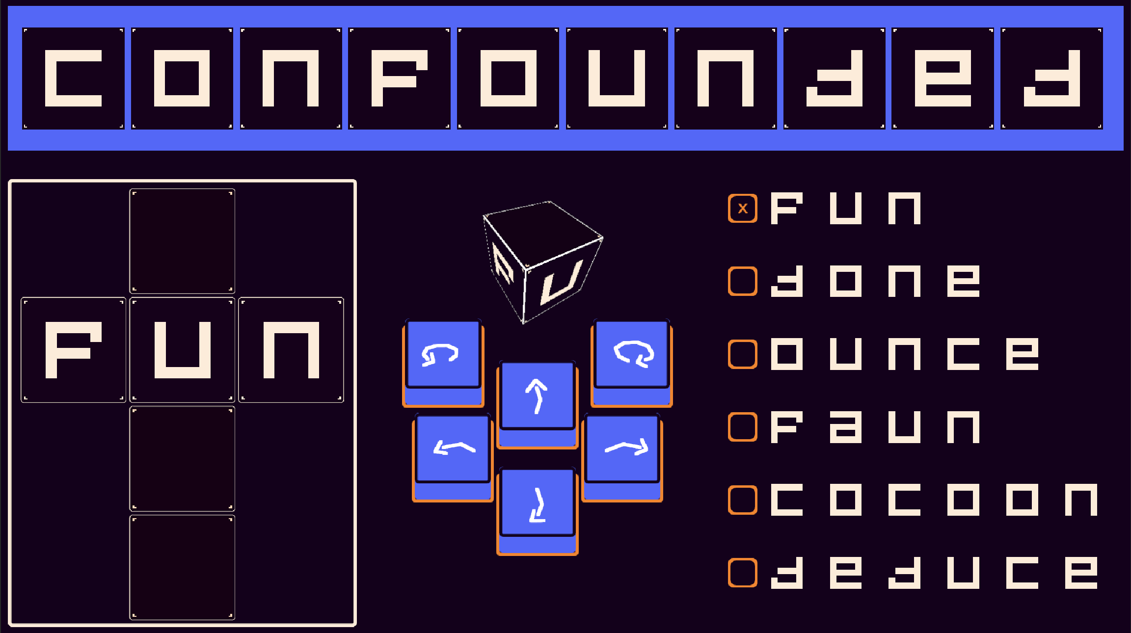 By dragging the letter tiles provided, create a die. Your die should be able to make all of the listed words. When spelling a word, your die must rotate 90 degrees between each letter (e.g. one 'button press'). Try and make one die that can spell all the listed words!This was similar to the original idea for Letter Coins, but that ended up shifting a lot over time, so I thought it could be a fun puzzle here. Hope you enjoy!